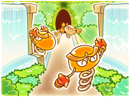 Banebous dancing around a garden in Bubble Bobble Double Shot