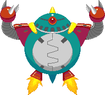 The Bubblun Robo is a large robot modeled after Bub. It has two jet boosters in place of its feet, a small tail, and a bluish-green body. It has two maroon pauldrons on either shoulder which connect to two extendable silver arms with red, ball-like hands featuring three claws on each. It has a yellow spike on top of its head mimicking Bub's spines, and a single red eye in the center of its face. Its stomach area is a gray hatch that serves as the cockpit.